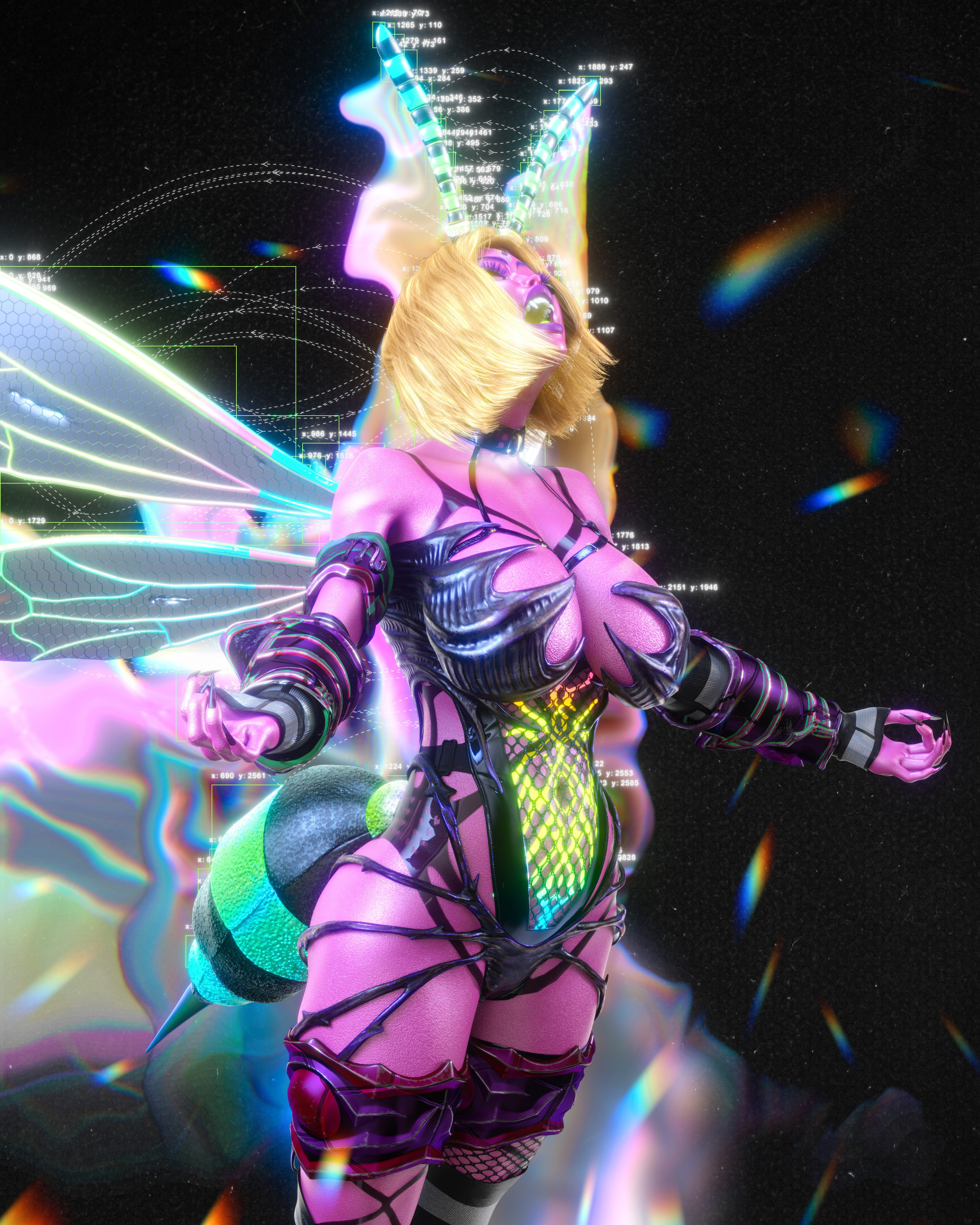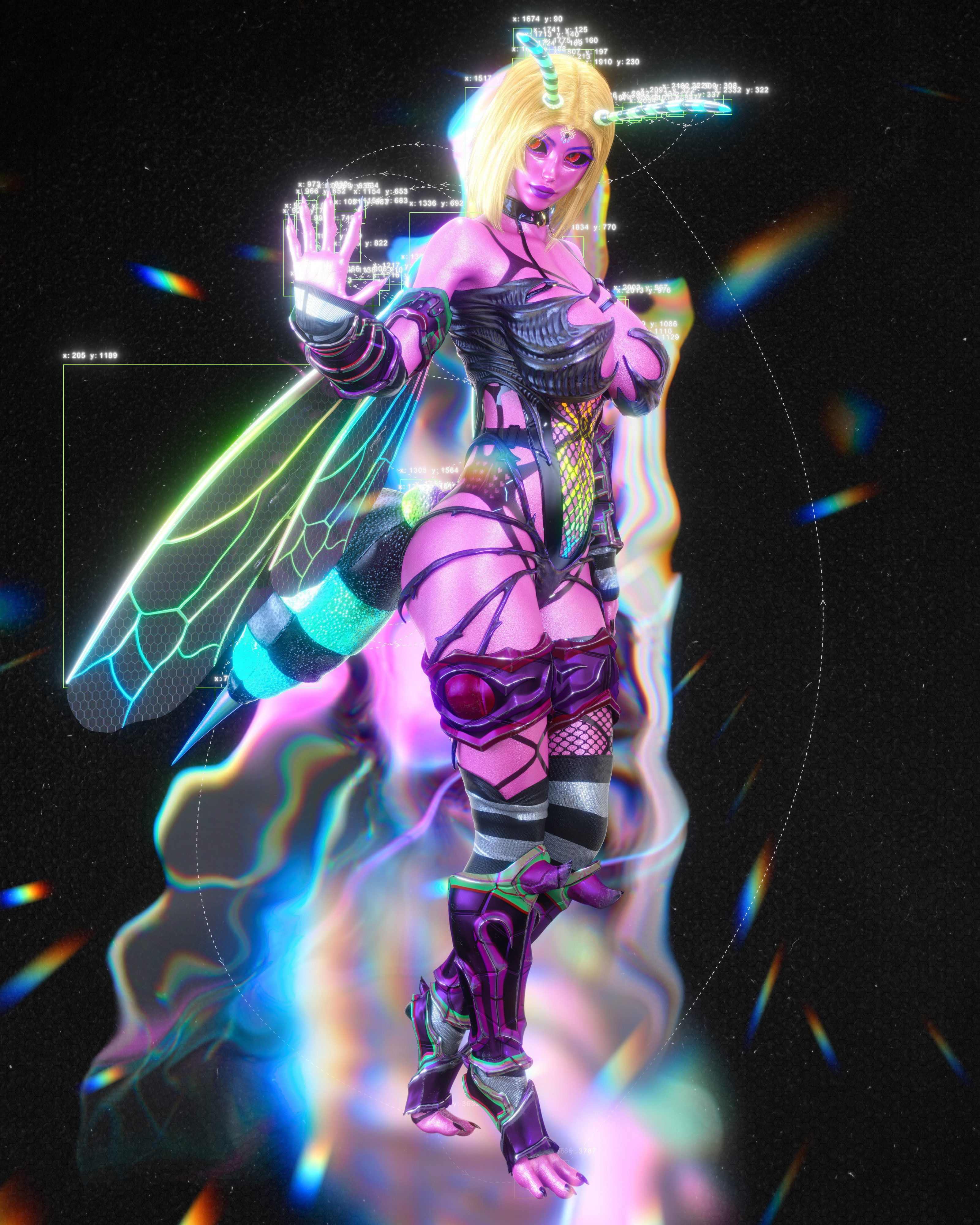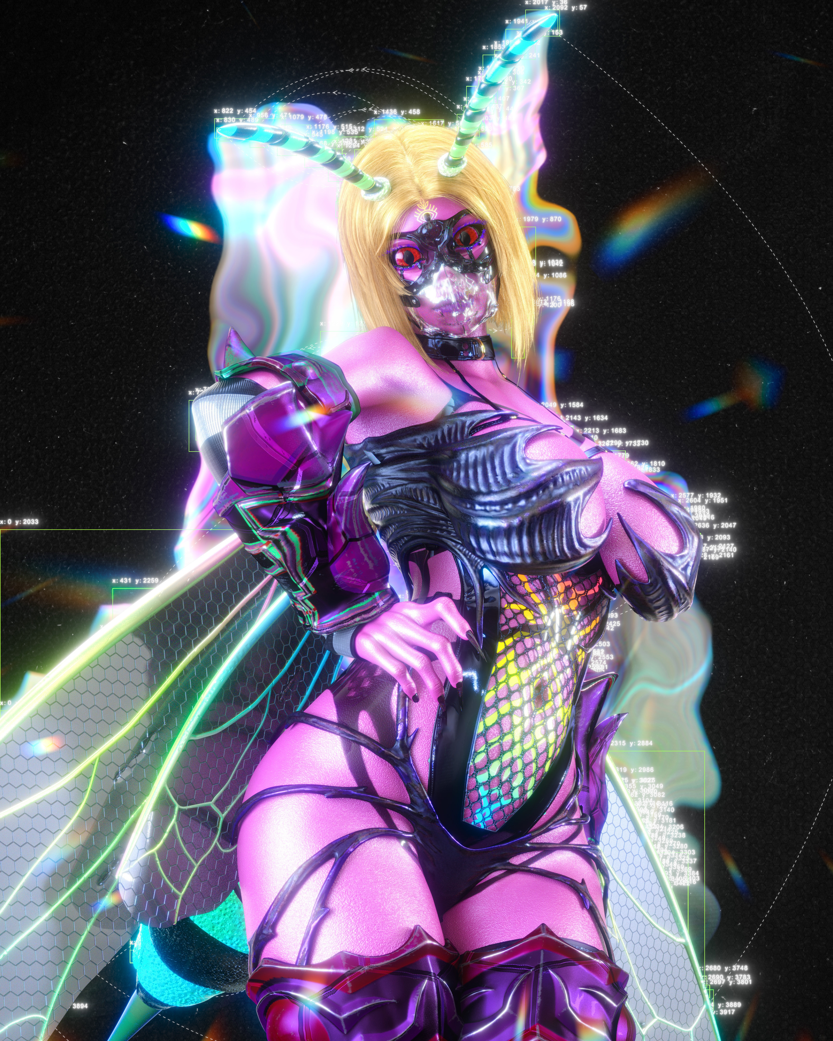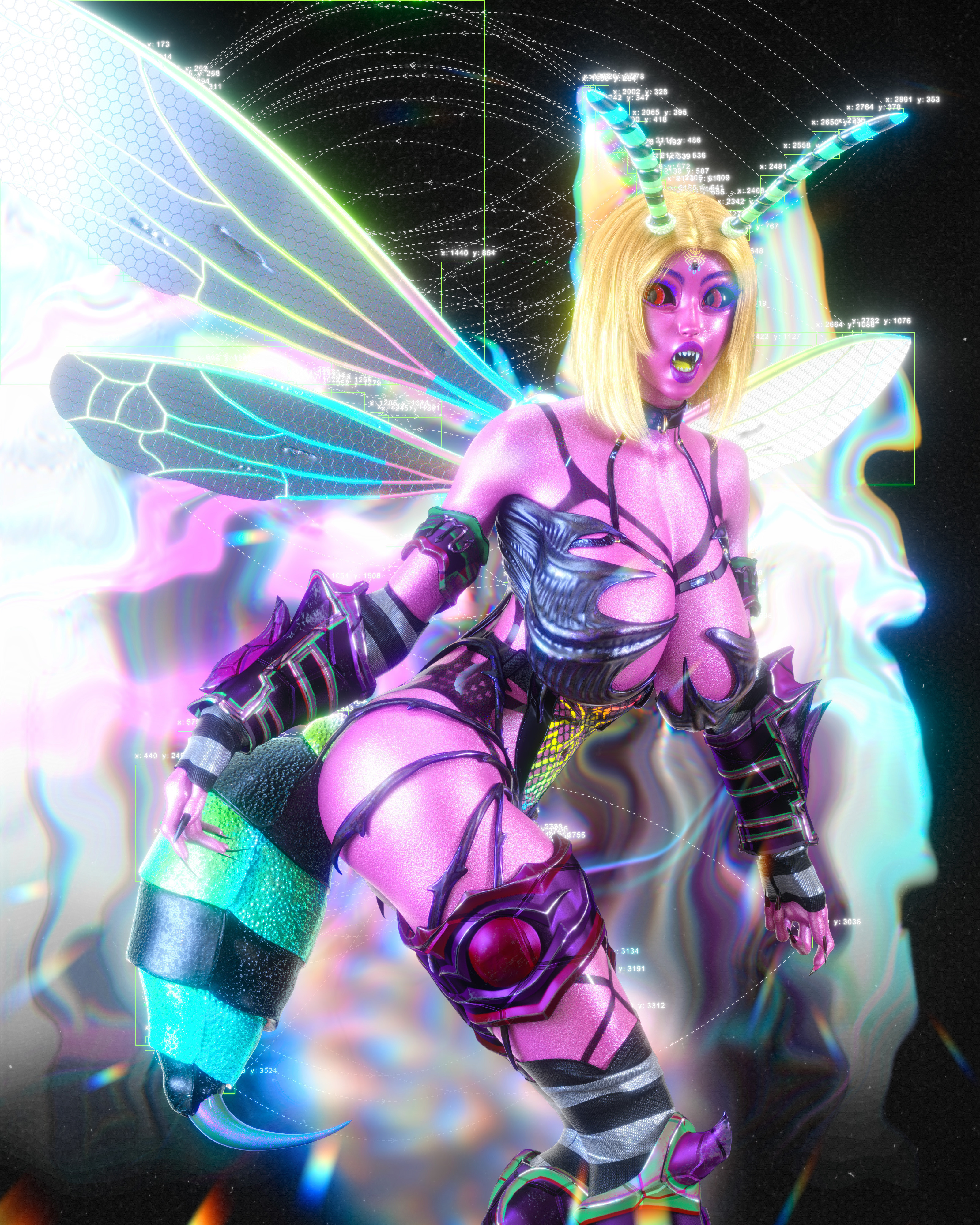 Mirix is a psionic wasp-human aberration, born of no hive native to this planet. Her presence is a soft hallucination/aromas that tilt perception and thoughts that hum into alignment. She is quiet, observant, and dangerously precise, a lone signal wandering through dense noise.