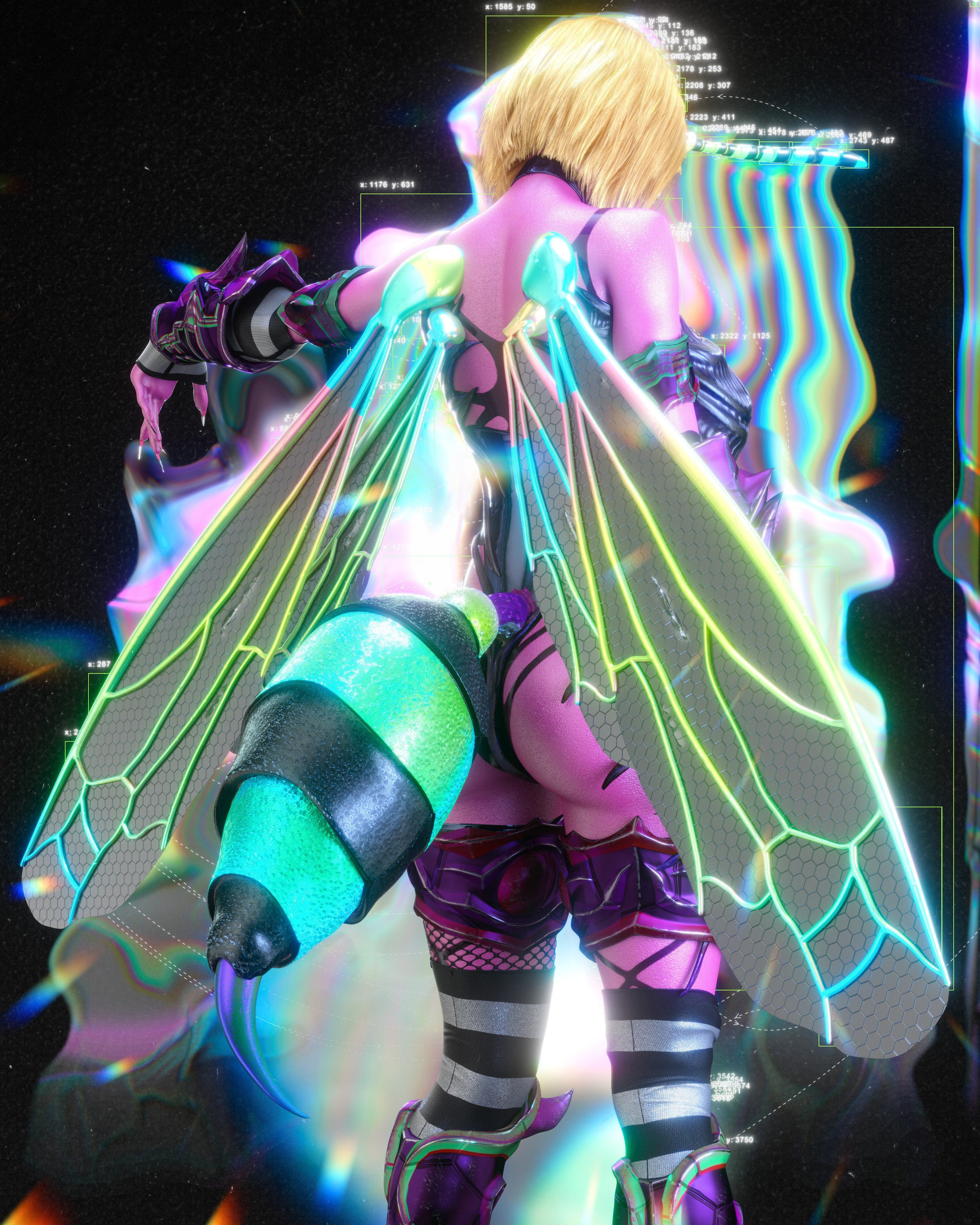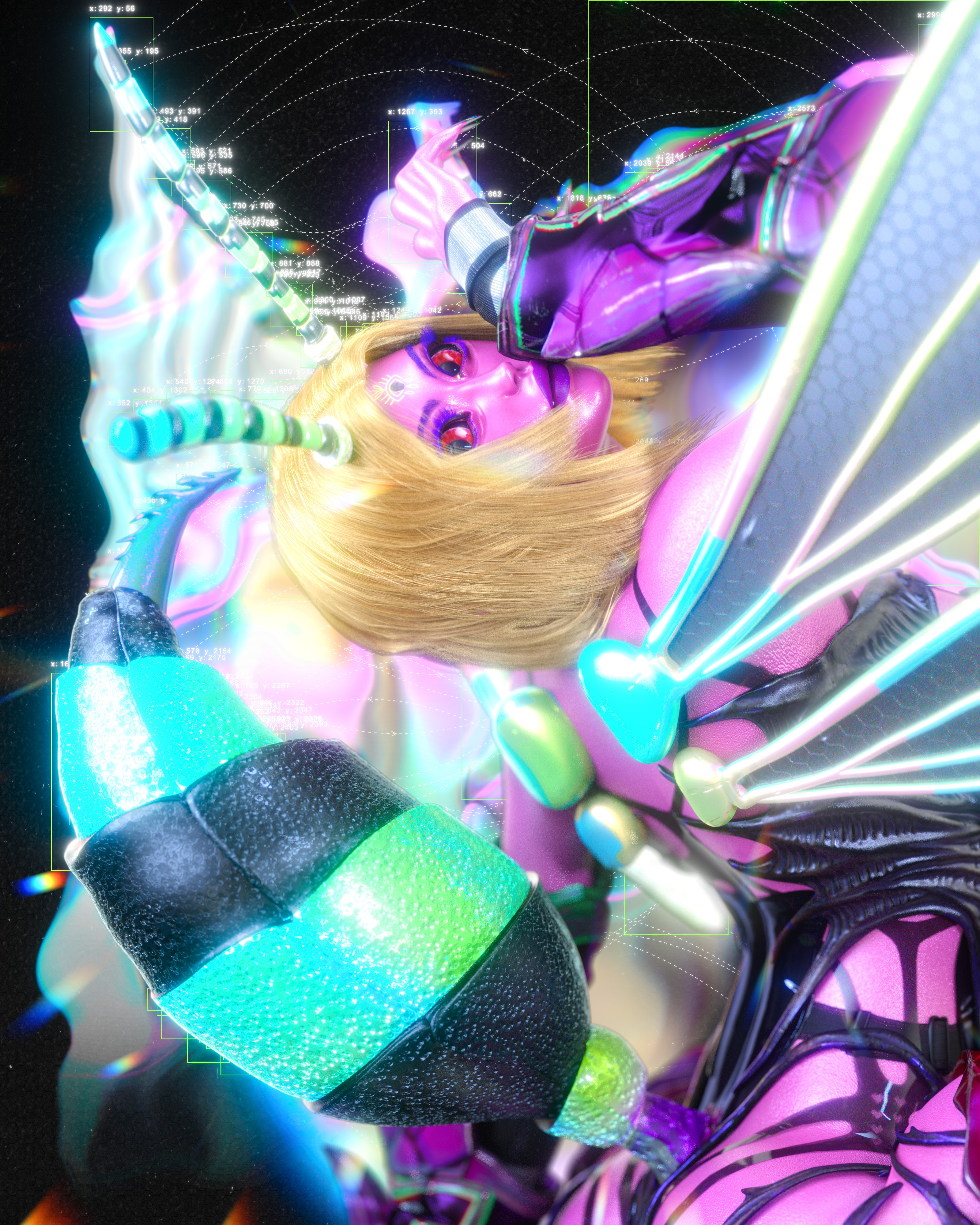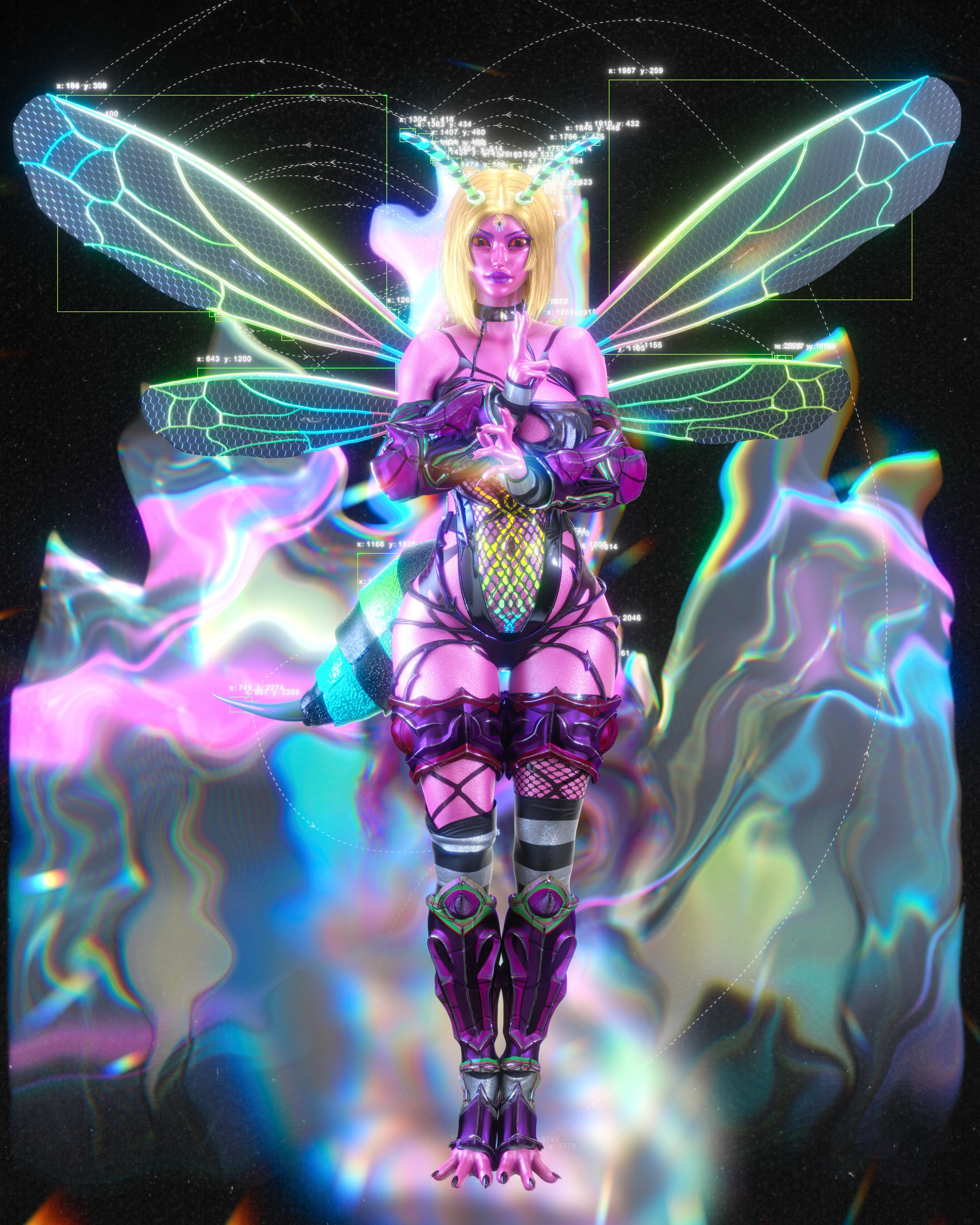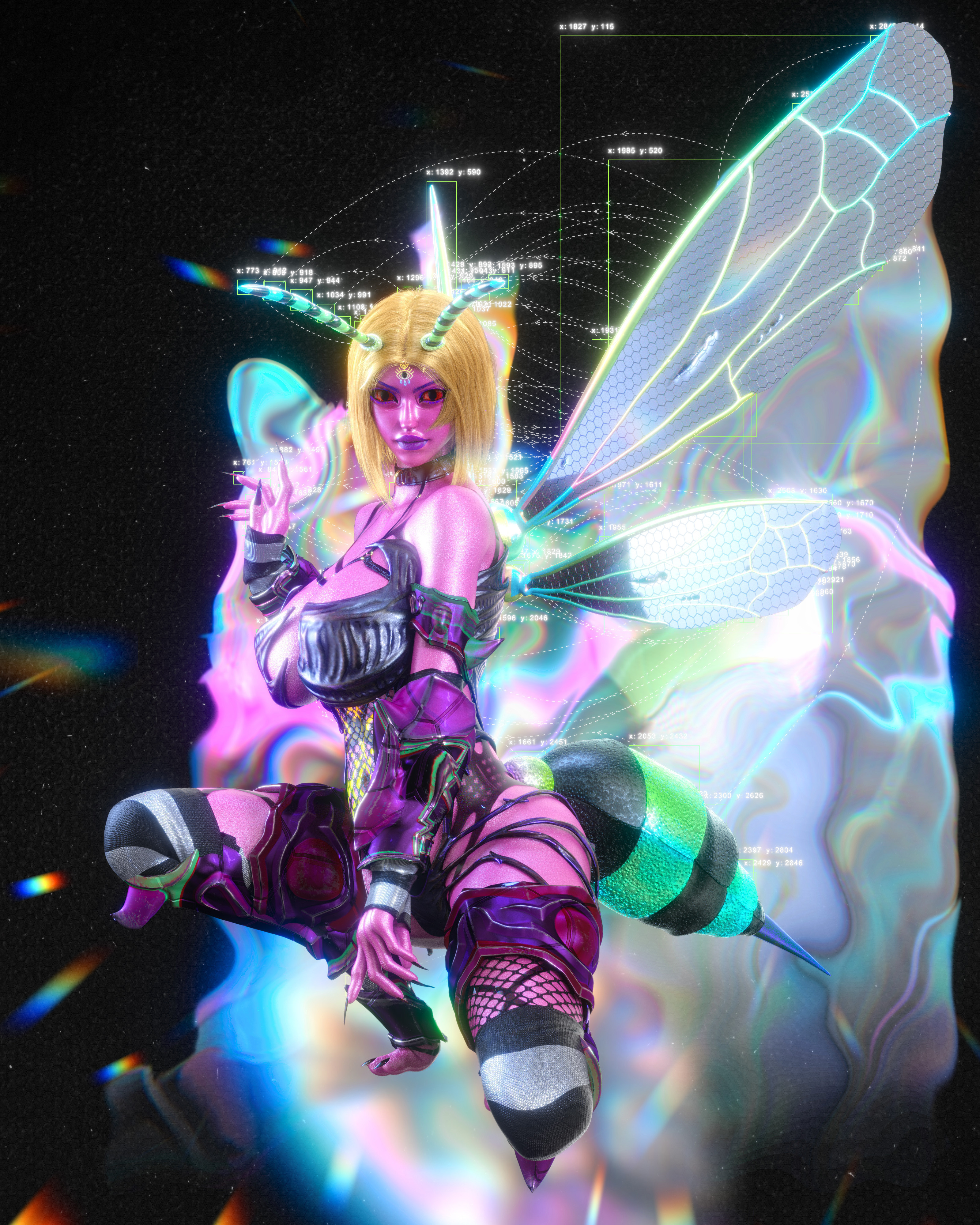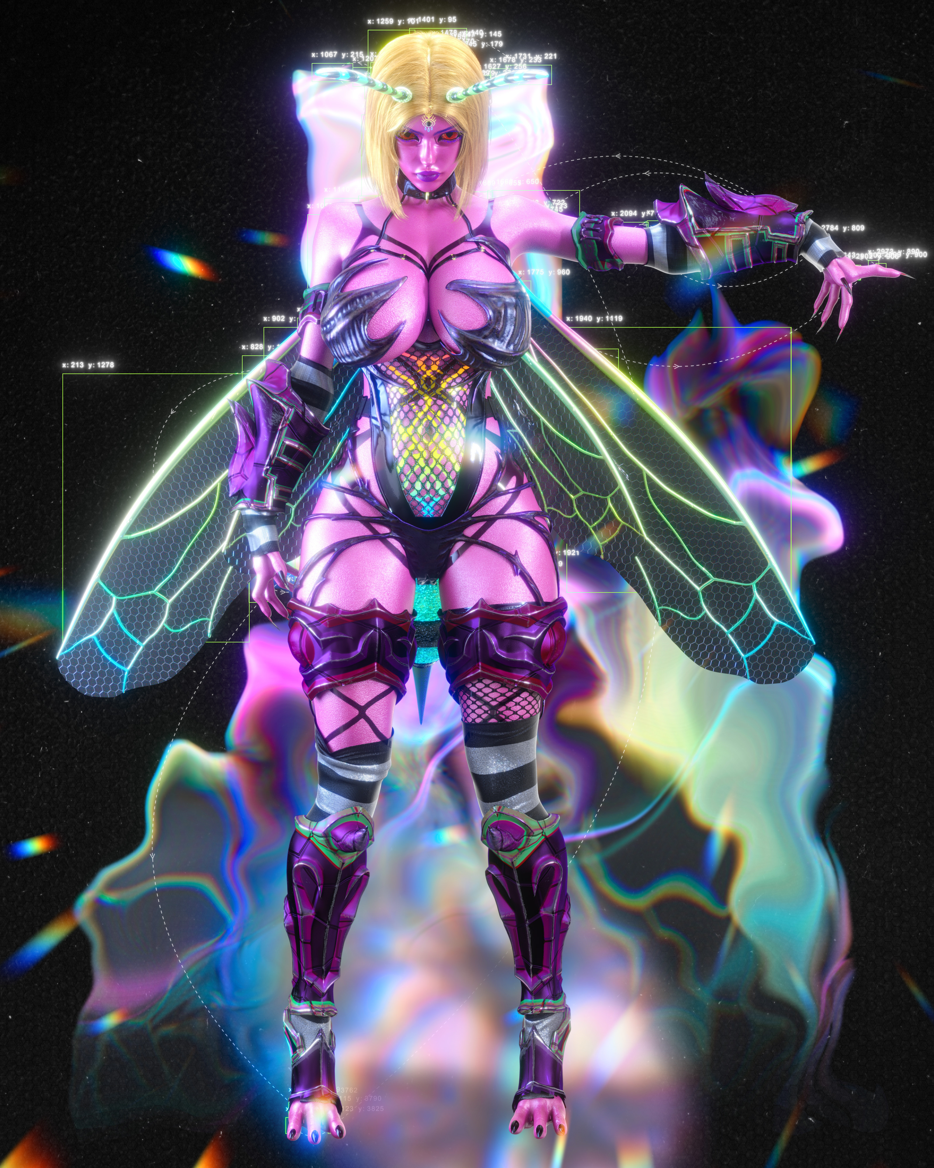 Mirix is a psionic wasp-human aberration, born of no hive native to this planet. Her presence is a soft hallucination/aromas that tilt perception and thoughts that hum into alignment. She is quiet, observant, and dangerously precise, a lone signal wandering through dense noise.