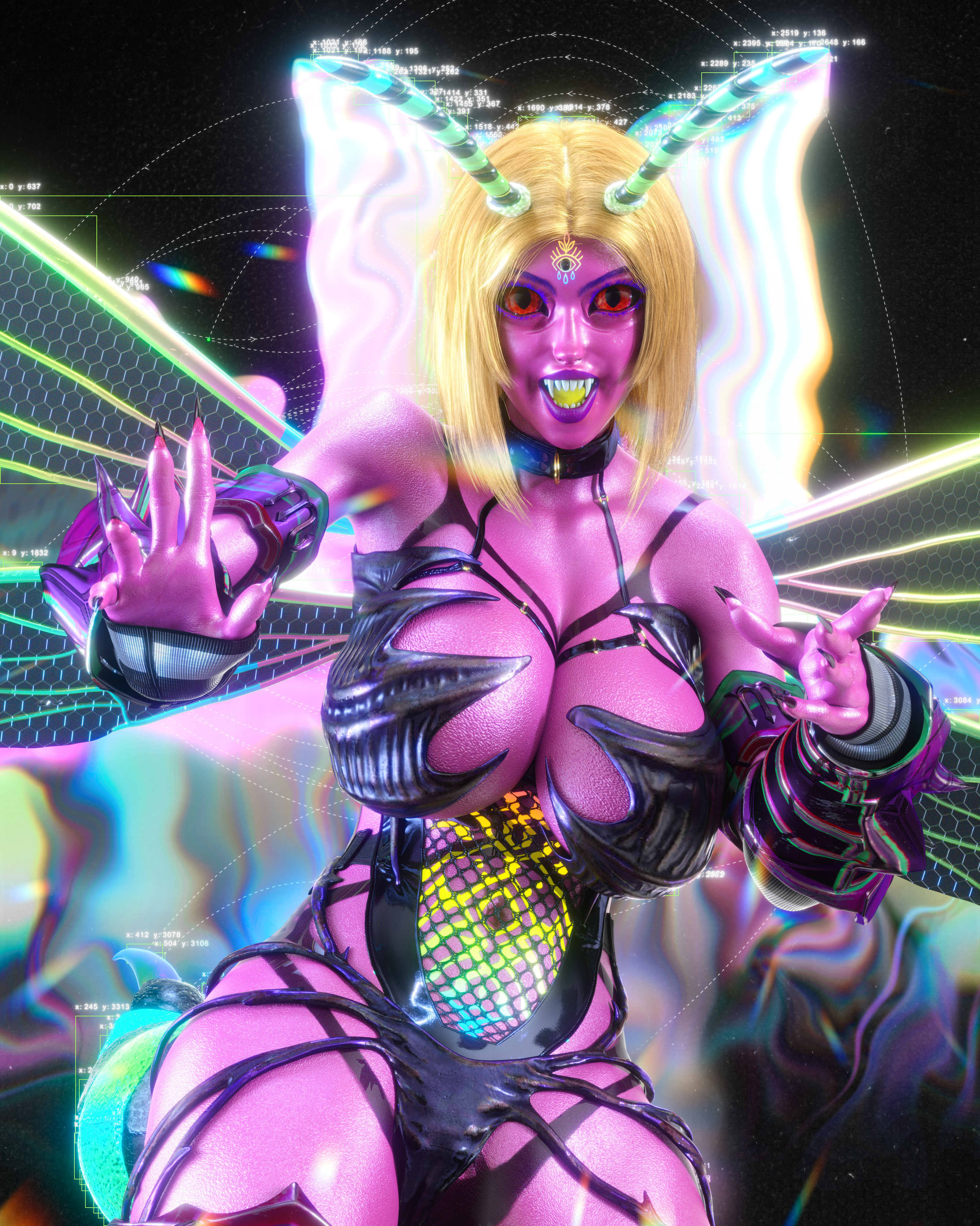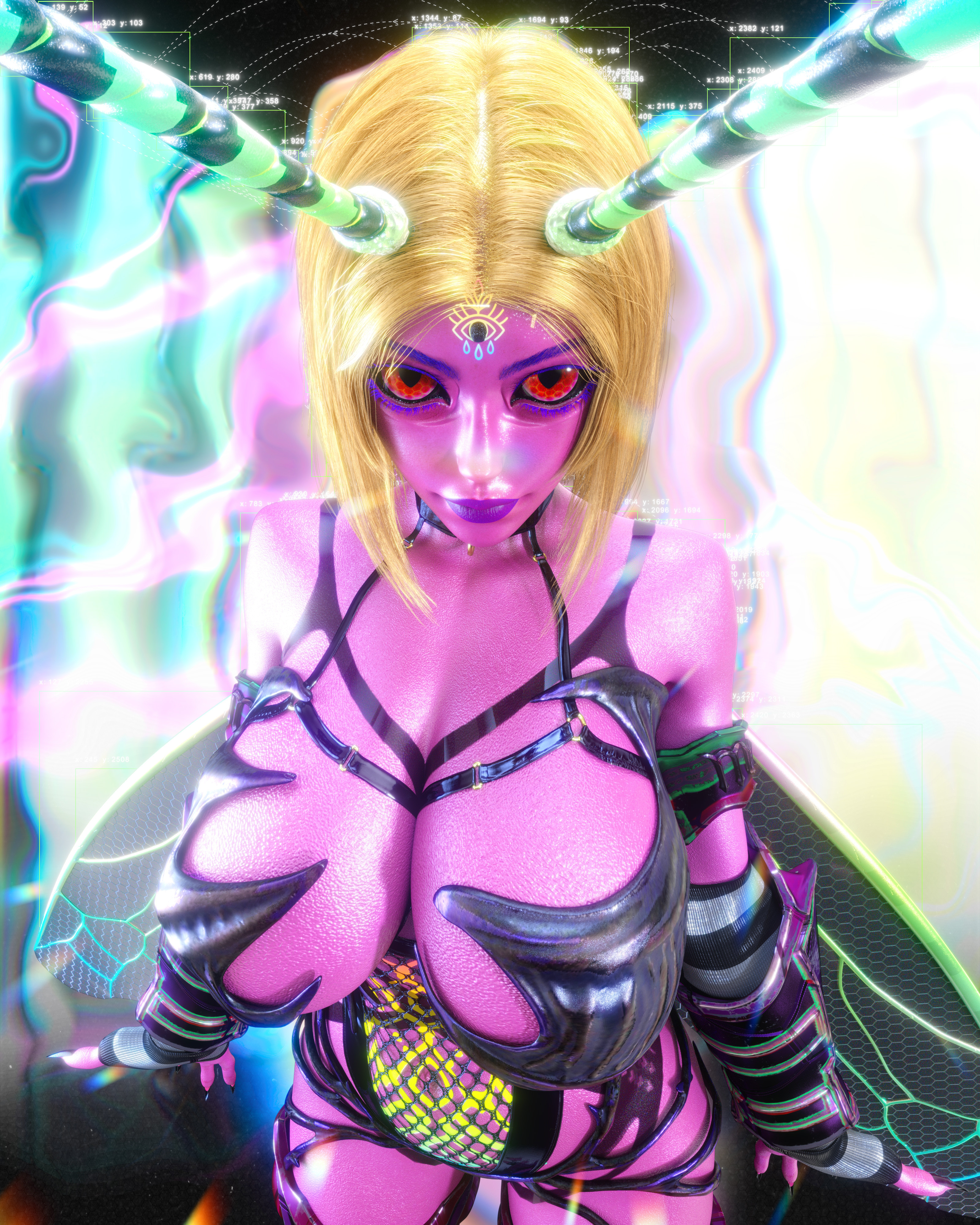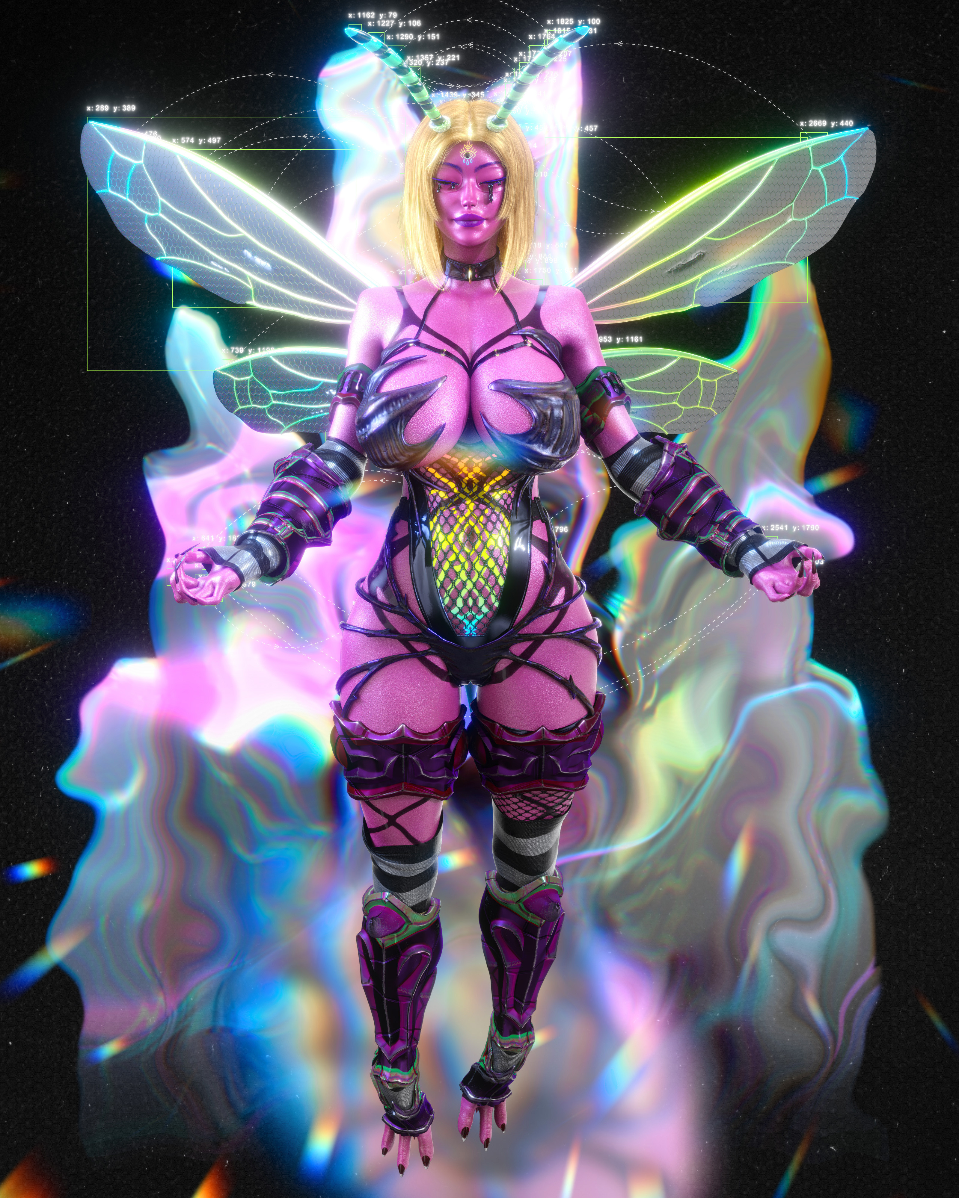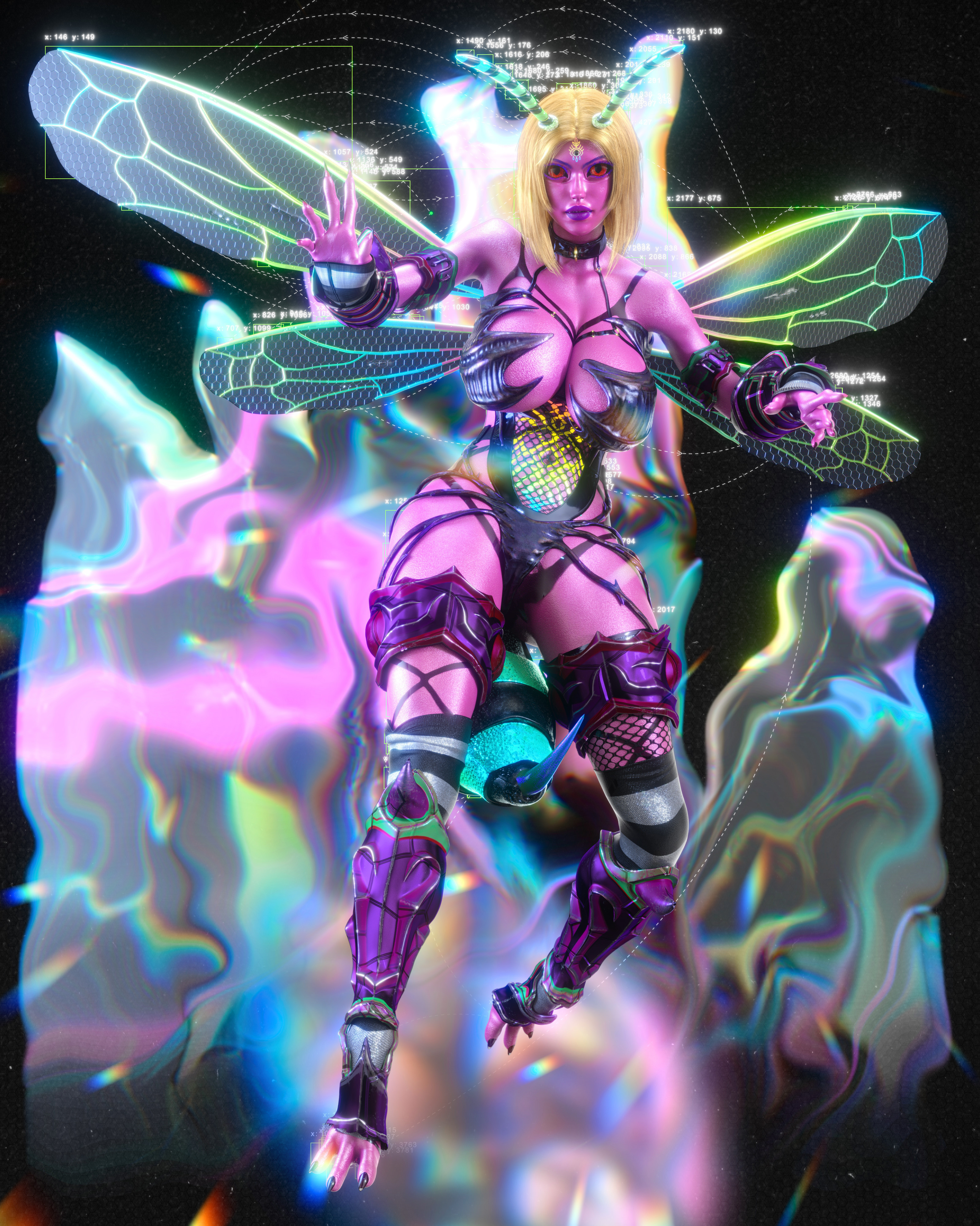 Mirix is a psionic wasp-human aberration, born of no hive native to this planet. Her presence is a soft hallucination/aromas that tilt perception and thoughts that hum into alignment. She is quiet, observant, and dangerously precise, a lone signal wandering through dense noise.