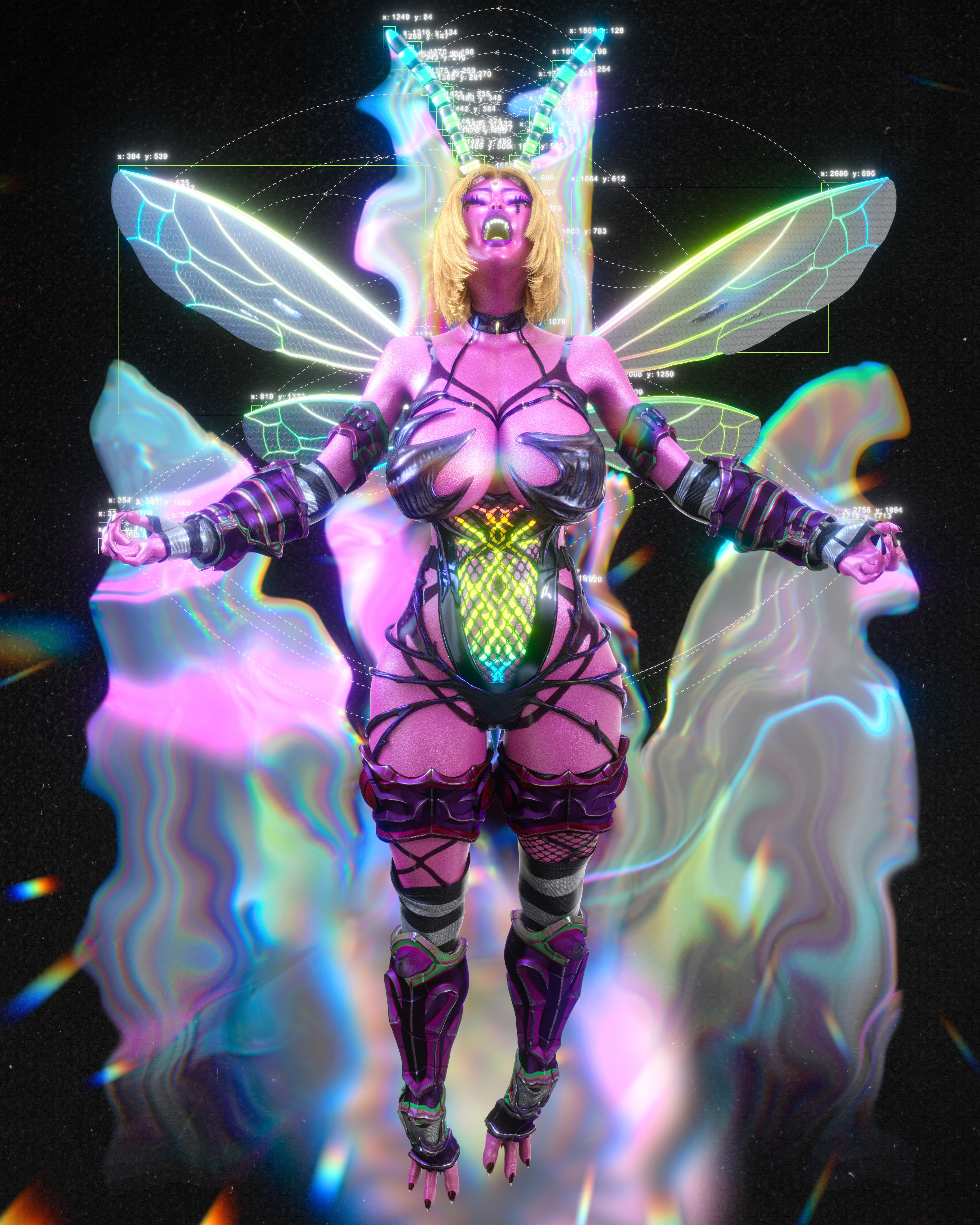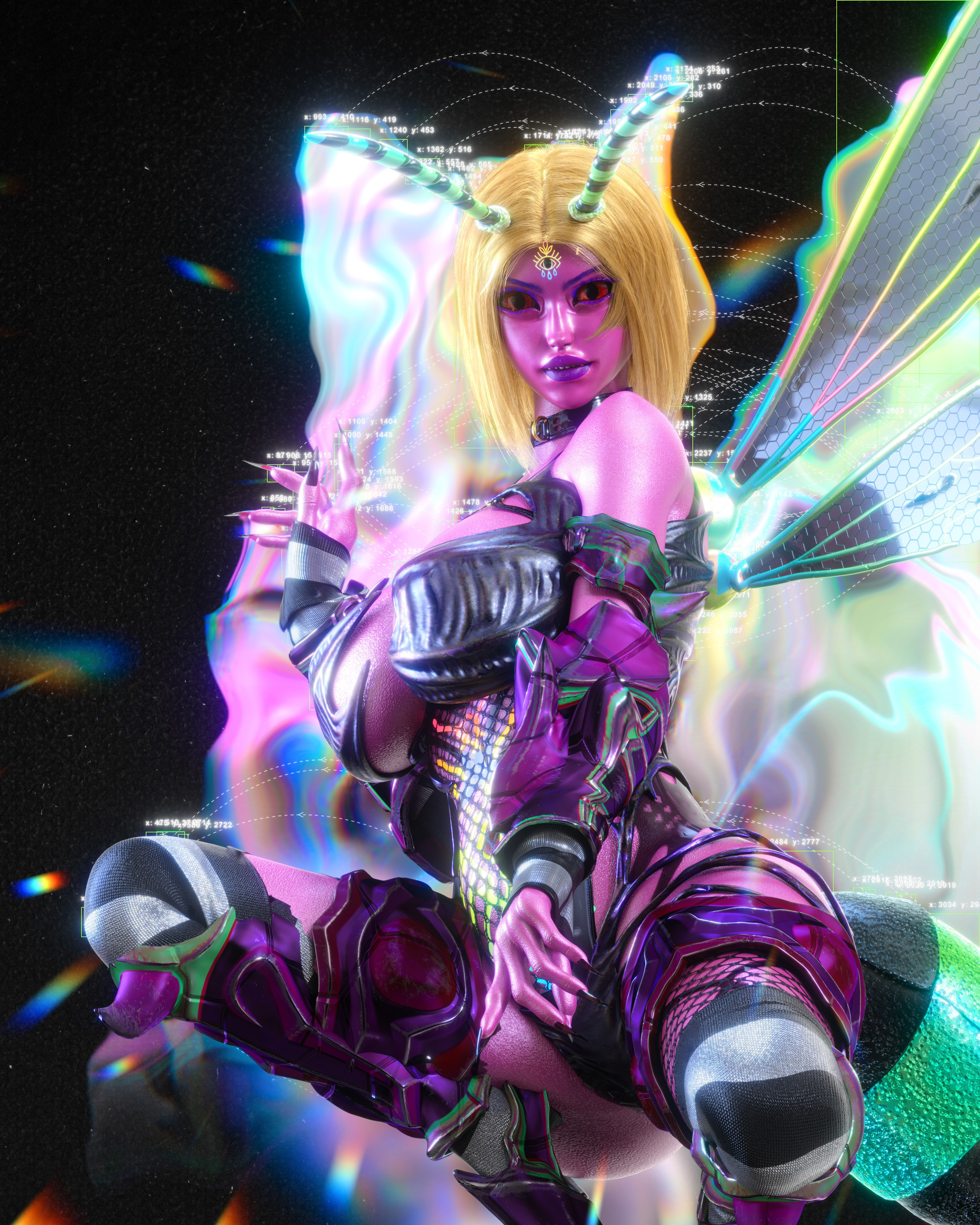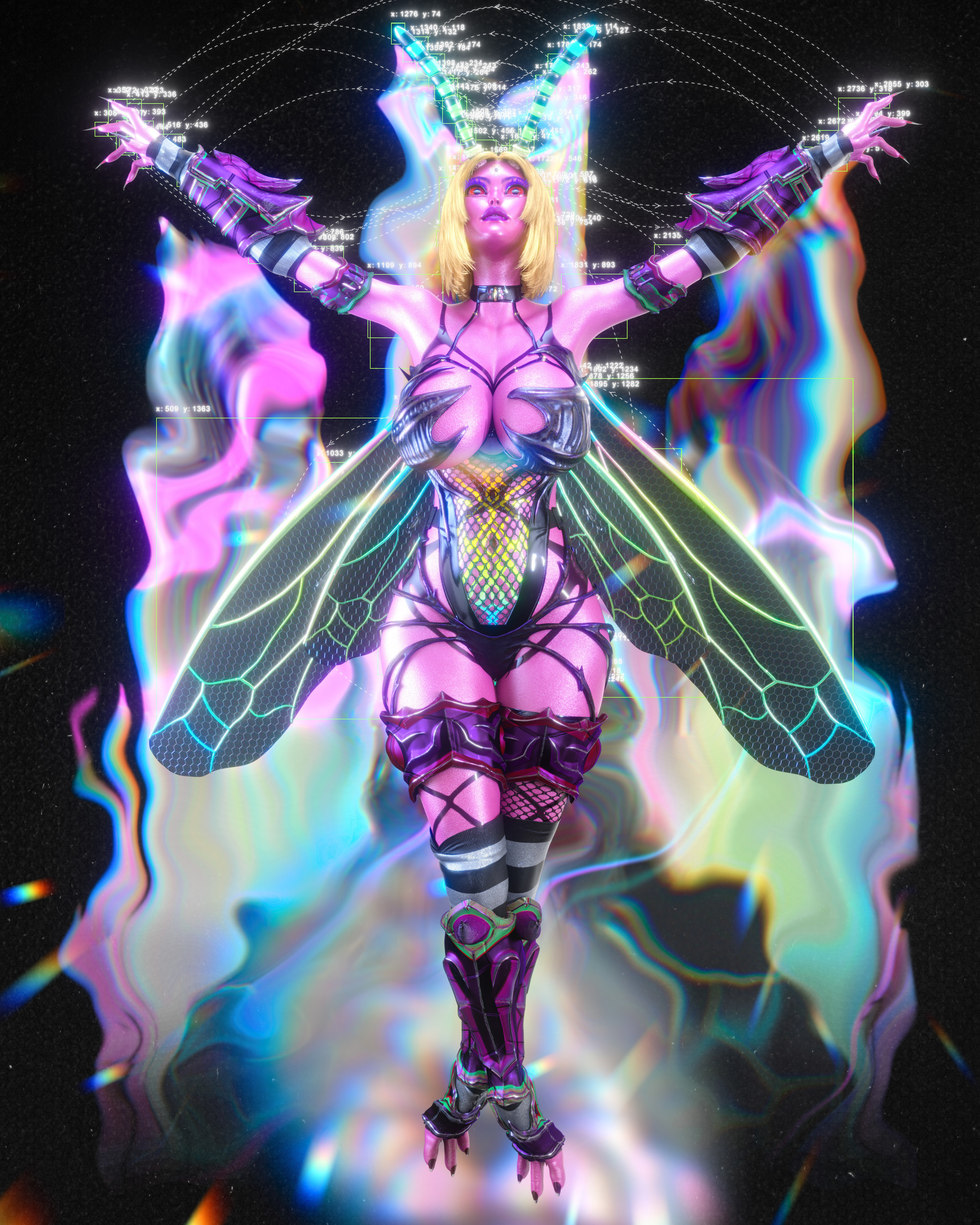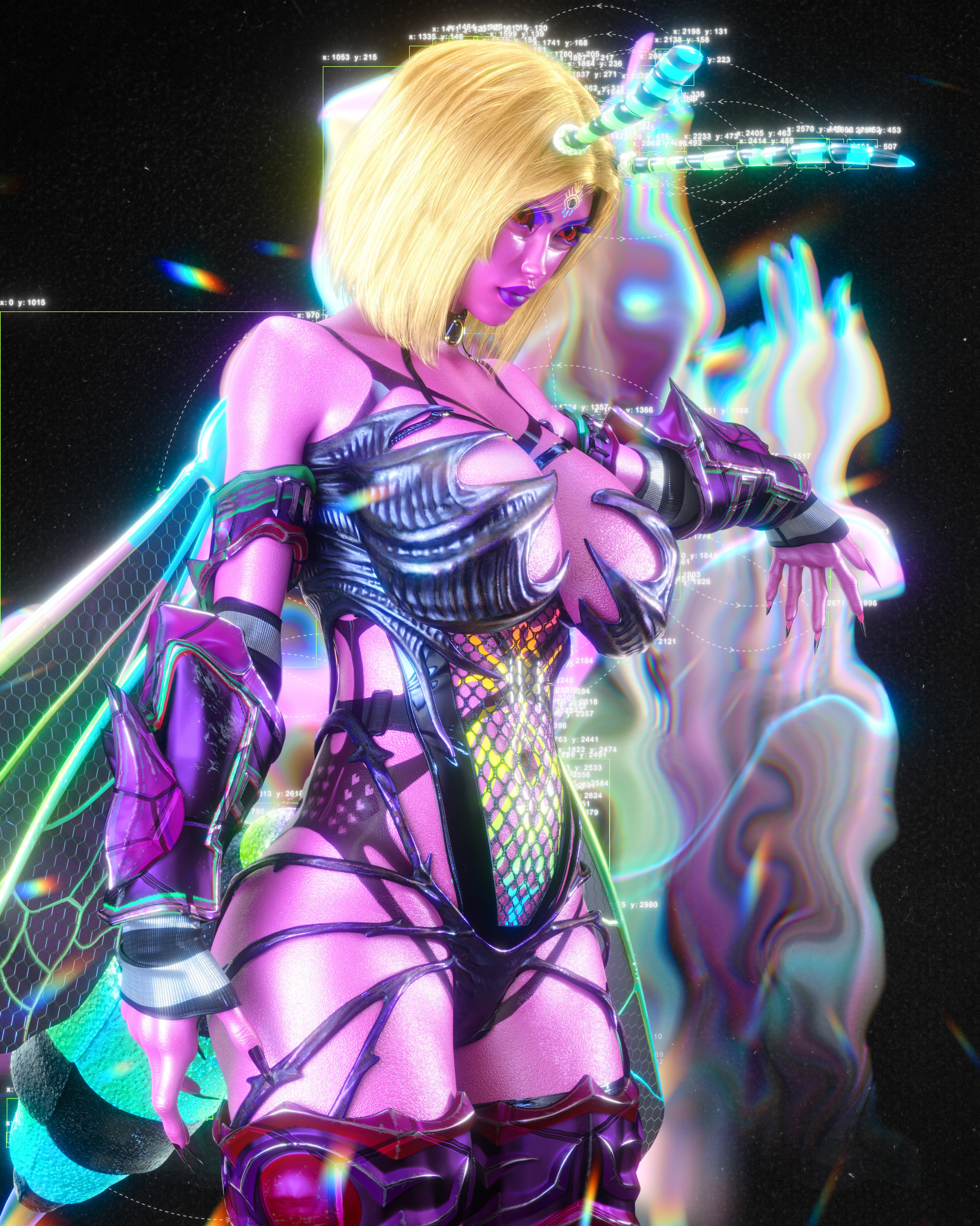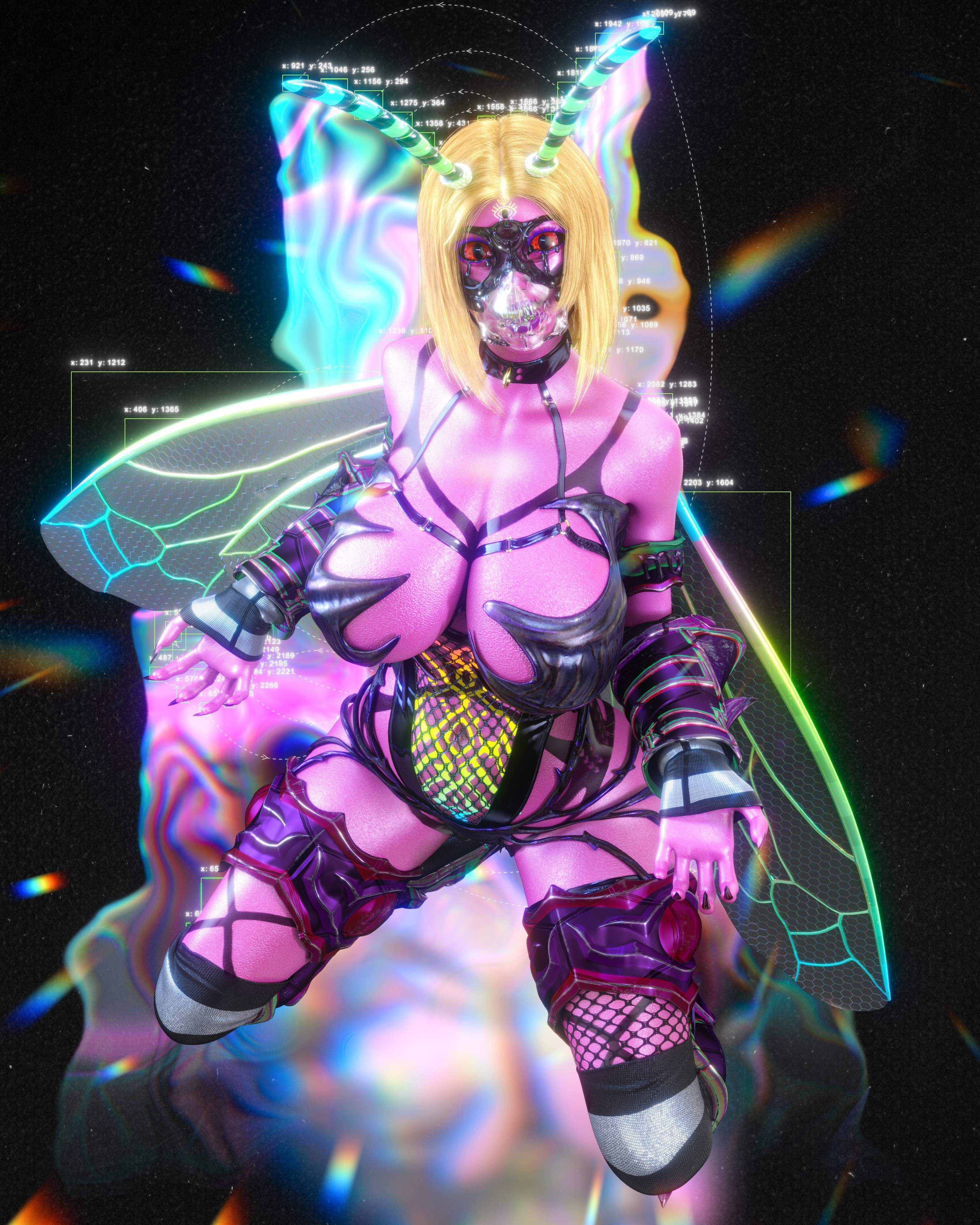 Mirix is a psionic wasp-human aberration, born of no hive native to this planet. Her presence is a soft hallucination/aromas that tilt perception and thoughts that hum into alignment. She is quiet, observant, and dangerously precise, a lone signal wandering through dense noise.